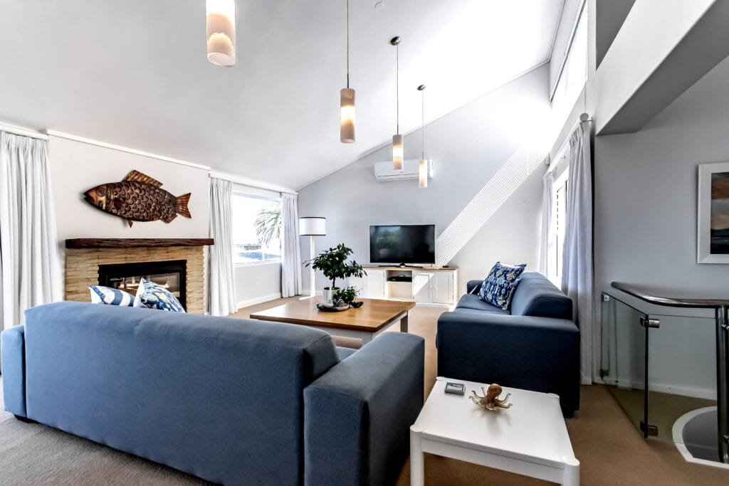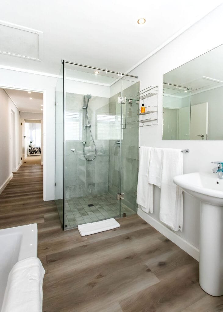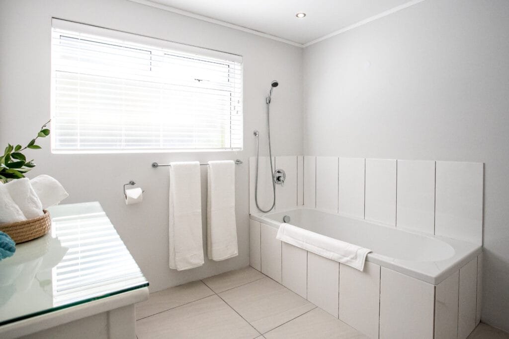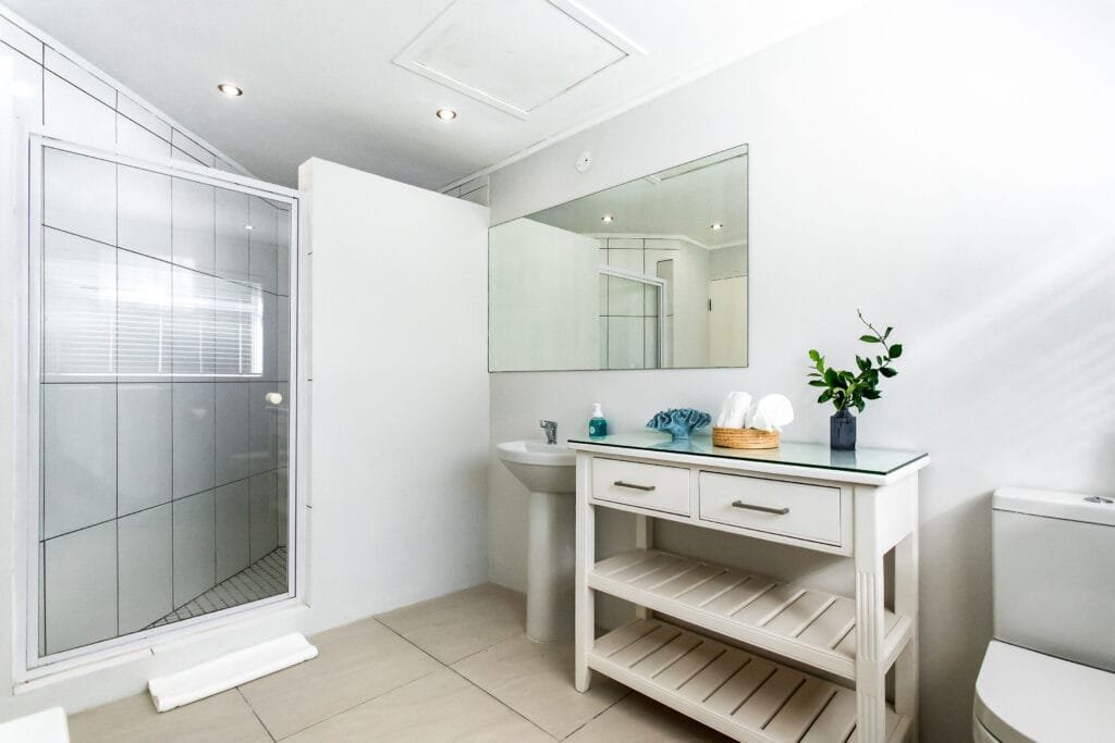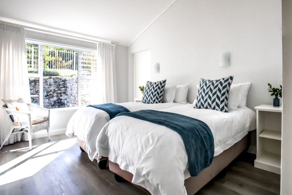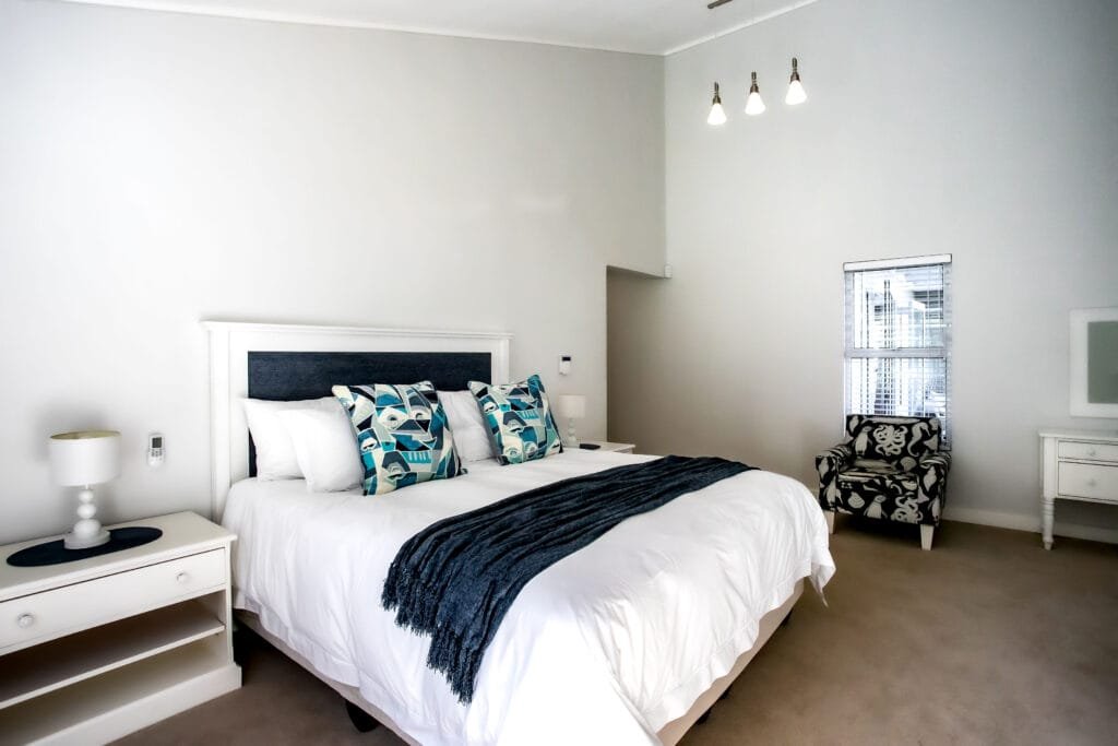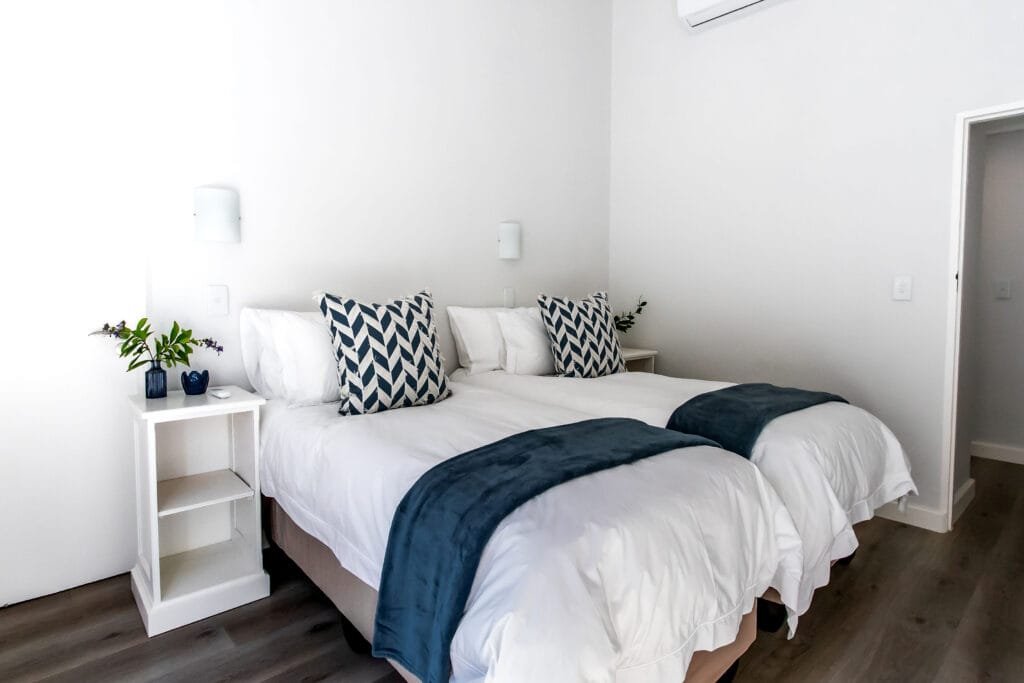 The master suite features a king-sized bed, an elegant ensuite bathroom, and beautiful natural light throughout the day. The second bedroom also boasts a luxurious king-sized bed, while the third bedroom is furnished with two comfortable single beds. A spacious full bathroom is shared between the second and third bedrooms.